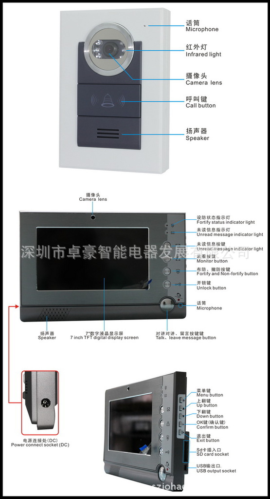 /电 源: 12V DC (注意:门口机不需要电源,由室内机统一提供)