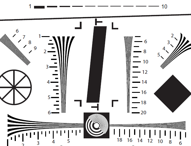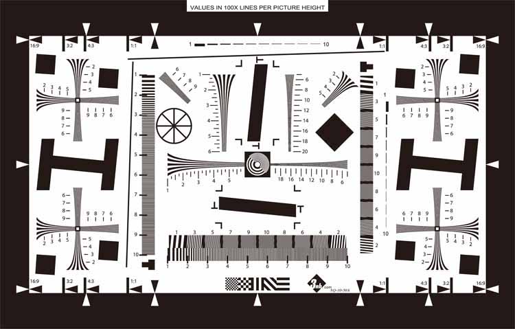 The ISO12233 is designed to measure resolution of still cameras. It contains resolution wedges up to 2000 lines per picture height. Furthermore it contains slanted edges for SFR measurement. On the test chart marks for the respective picture size are arranged (square = 1:1; usual digital format = 4:3, small picture = 3:2 etc.). The camera has to be adjusted that the whole picture height is captured an the appropriate picture proportion is seen. The numbers at the lines each mean “lines/picture height x 100”; e.g. 12 = 1200 etc. Thus evaluation of a camera is possible with the aid of the horizontal and vertical lines. The specified resolution should be the value in the center of the picture on optimal conditions. Thus the quality of lenses, sensor and image computation is evaluated simultaneously. With open iris end extreme zoom position the result can be worse. This has to be tested and noted separately in the test report. Important is the separate evaluation of resolution in the picture corners.