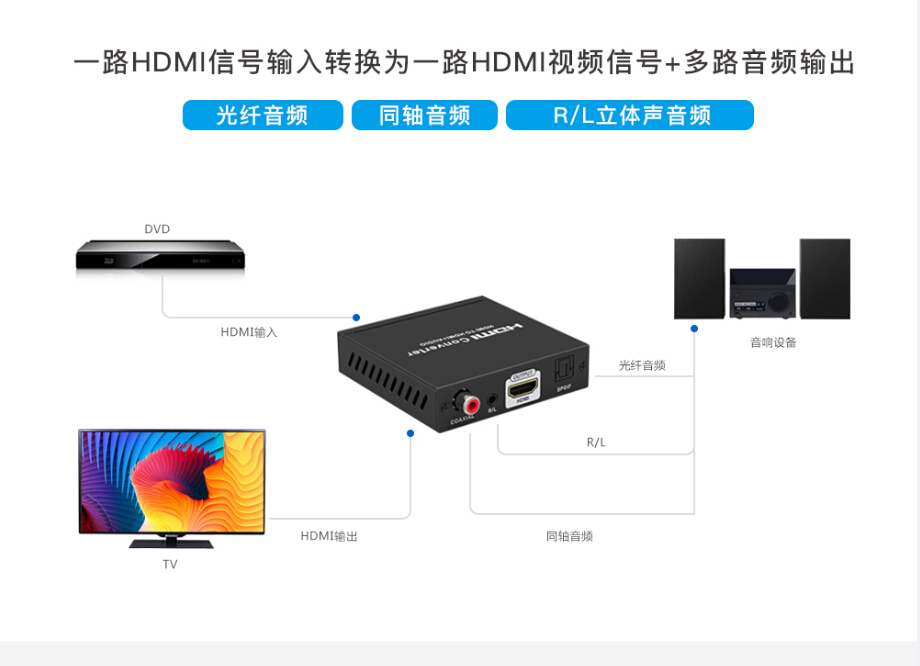 1. 1路HDMI信号输入转换为1路HDMI音频信号+SPDIF音频+同轴音频+R/L立体声音频输出(SPDIF音频与同轴音频不能同时输出,使用ARC功能时,R/L立体声输出不可用)