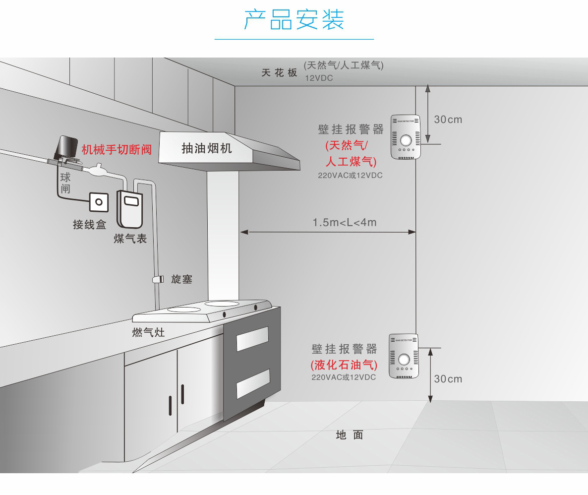 ² 安装位置,将报警器安装在低于天花板0.3-1m处,距离气源半径1.5m的位置,如下图: