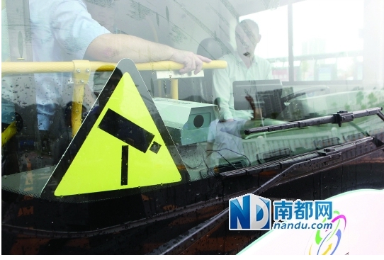 一辆公交车车头安装了抓拍占用公交道摄像头。南都记者 赵炎雄 摄