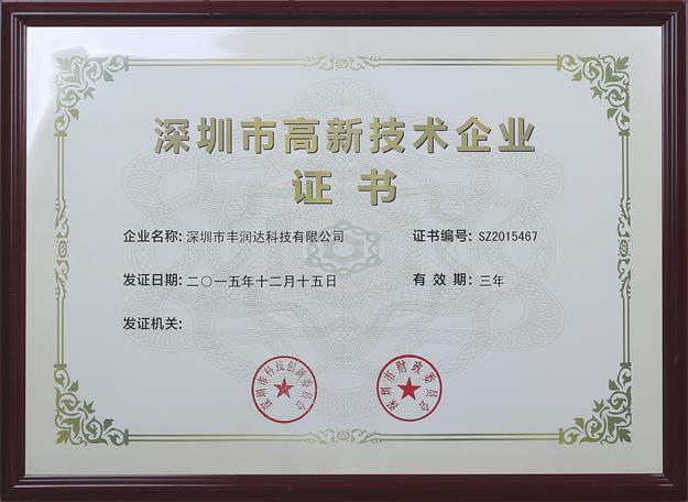新年伊始,丰润达喜讯不断,再次成功获得由深圳市科技创新委员会、深圳市财务委员会联合下发的"深圳高新技术企业”证书。