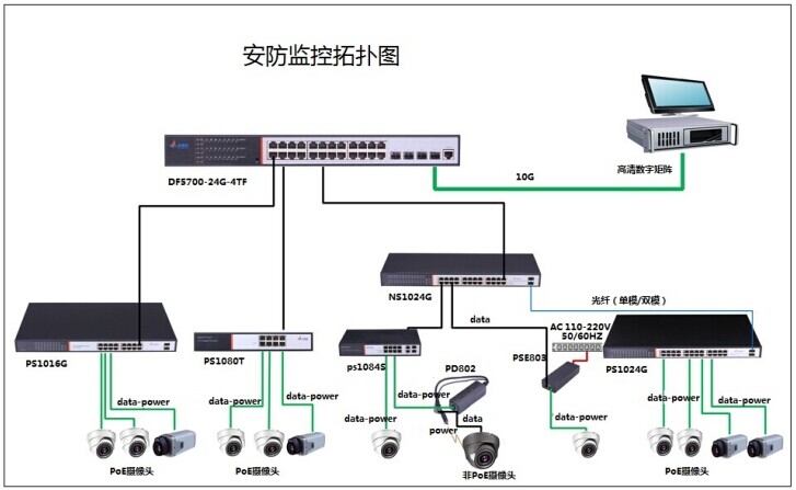 如图,在此监控方案中,采用丰润达PS1016G、PS1080T、PS1084S、PS1024G等PoE供电交换机做接入交换机,给前端的监控摄像头供电,NS1024G为汇聚交换机,将监控摄像头的视频数据通过光纤传输给数据中心的核心交换机DF5700-24G-4TF,最终传输给视频显示设备。