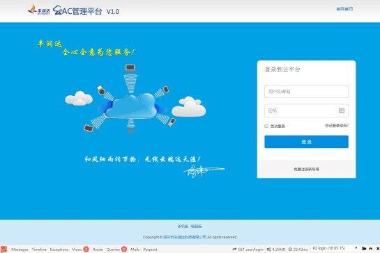 云AC平台:点击自动跳转到丰润达云AC管理平台,在该页面,可以登录已有AC平台账号,也可以注册新账号。通过该功能,可对众多AP进行升级、配置、设置SSID、修改信道和密码等。