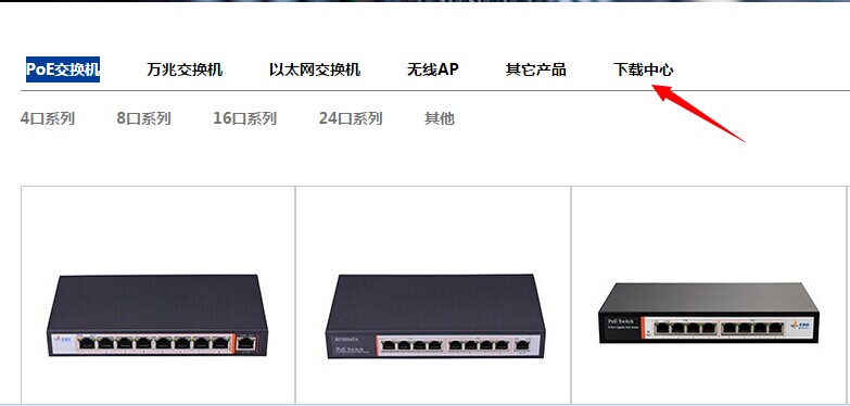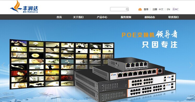 首页中4张自动更替的横幅图片,其中3张分别展示丰润达主要产品:PoE交换机、无线AP、万兆交换机,点击对应图片就可以进入到产品页面。
