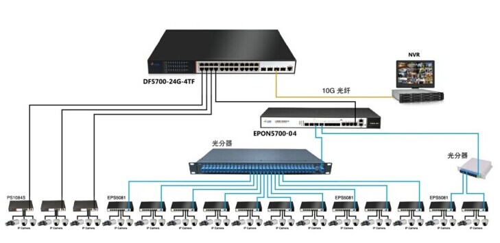 为应对上述实际问题,丰润达提出创新的PON-PoE解决方案,该方案基于先进的PoE及EPON技术实现全光覆盖,顺应当下的网络架构趋势,遵从“大容量、高带宽、广覆盖、低成本”的原则,助力监控网络化建设。