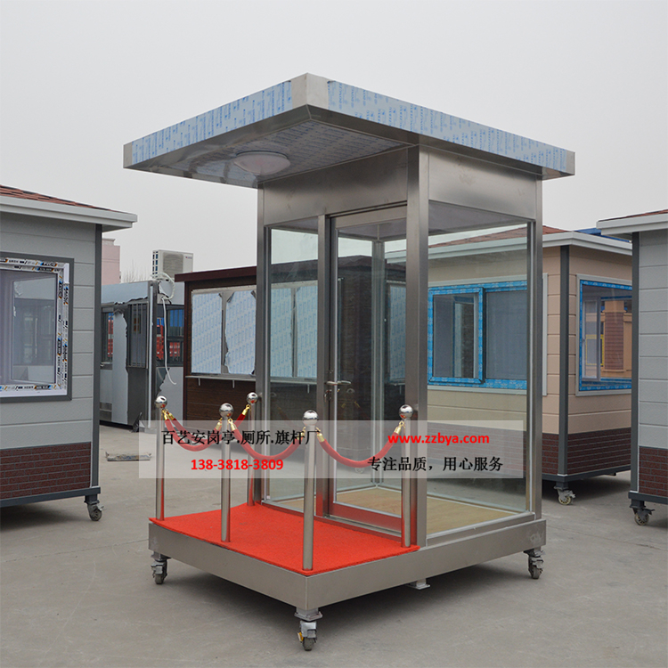 玻璃岗亭主要材料顶部:不锈钢板、钢管、防水卷材、硅酸钙板、PVC扣板。我公司的玻璃岗亭所用的PVC扣板,地板为花纹铝板或复合地板,耐力板、钢化玻璃顶部材料采用特殊防水铰接工艺,彻底解除漏水之患;
