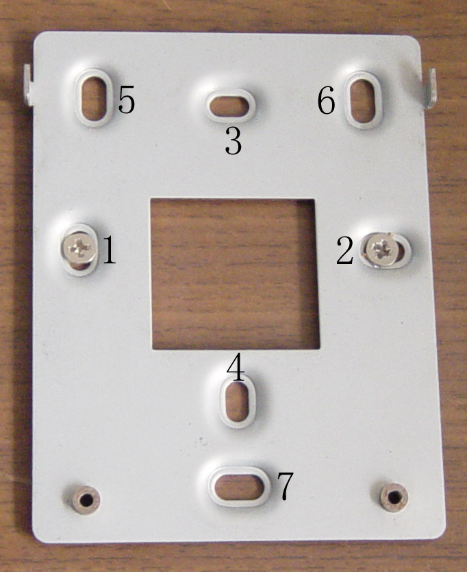 方法三:设备安装位置无预留“86” 暗盒直接上墙的,用M4自攻螺丝穿过挂板孔“5、6、7”固定即可。