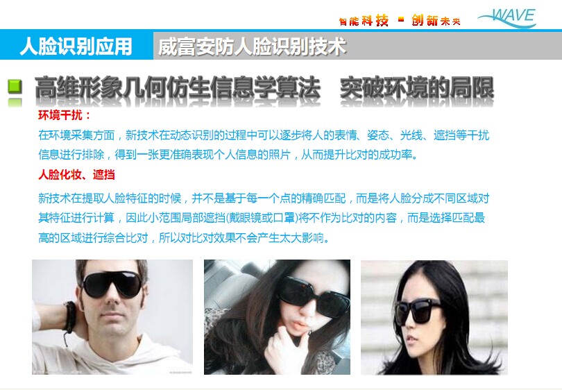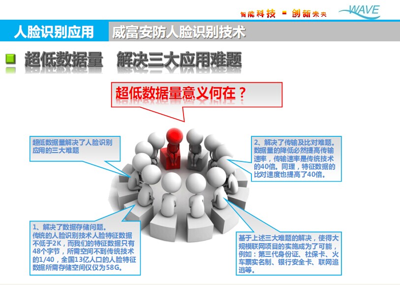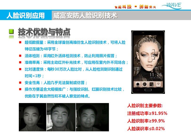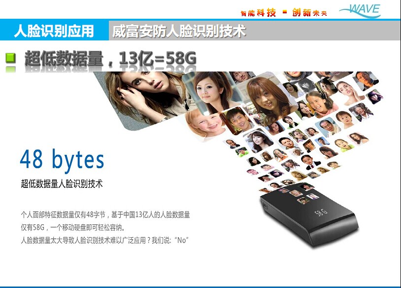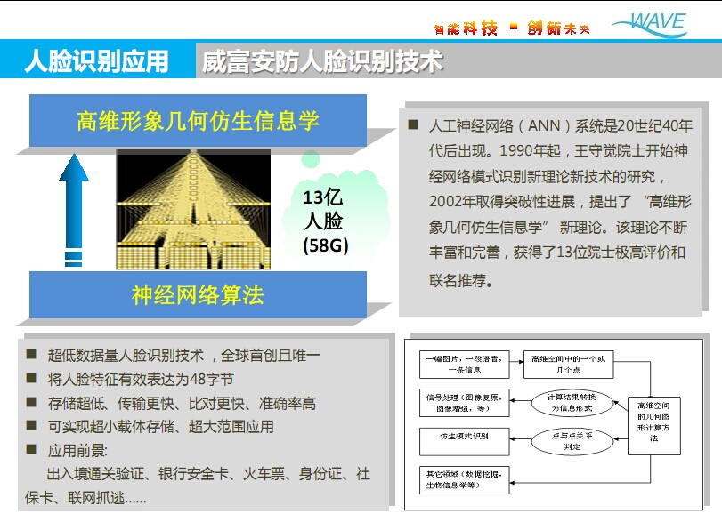 威富基于王守觉院士的高维形象几何仿生信息科学,创新研究出超低数据量人脸识别技术(被列入国家科技攻关计划、863计划、国家自然科学基金重大研究计划),将人脸特征有效压缩为48字节,是人脸识别技术领域的重大突破。