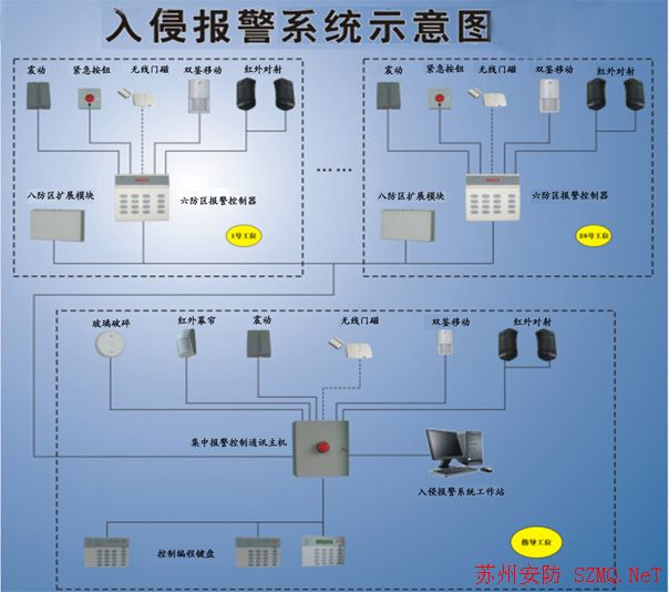 入侵报警系统通常由前端设备(包括探测器和紧急报警装置)、传输设备、处理/控制/管理设备和显示/记录设备部分构成。