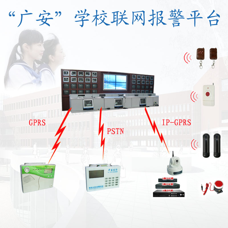 为了有效的解决校园安全问题,加强学校学生进出口及重要部位(如:微机室、实验室、图书馆、档案室、电教室、车库等)的安全,我们专门为学校设计了一套适用于学校安全的联网报警系统,该系统有效的解决了学校重要部位的报警需求,有效的避免巡逻盲区,提高学校安全保卫及综合管理能力。将广安报警主机及平台客户端安装在学校的监控室,并与安装在学校各个出入口、走廊等部位的视频摄像头相连接。红外探测器安装在微机室、实验室、财务室、图书馆、档案室、电教室、车库等部位,一旦有人闯入学校实施暴力犯罪活动或非法入侵要害部位时,学校保安员可以触发安装在门卫室的紧急报警按钮或随身携带的摇控报警器。无人的防区遇有非法入侵时,红外探测器将自动报警。触发报警后,学校保卫室的警号立即响起,报警设备自动将现场情况(包括现场视频)传送到公安局110指挥部,视警报警情况指调110民警迅速赶到现场进行处置。