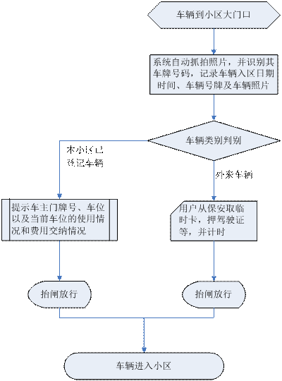 当有车辆驶近小区大门时,系统自动检测到车辆的驶近,自动抓拍车辆照片,并识别出该车辆的车牌号码,无须地感触发,记录入区时间、车牌号码、车辆照片,然后通过查询数据库内的登记车辆记录,确定该车的类型(本区车辆或外来车辆)。根据车辆类型的不同可采取不同的控制策略,主要可以分为以下的两种情况: