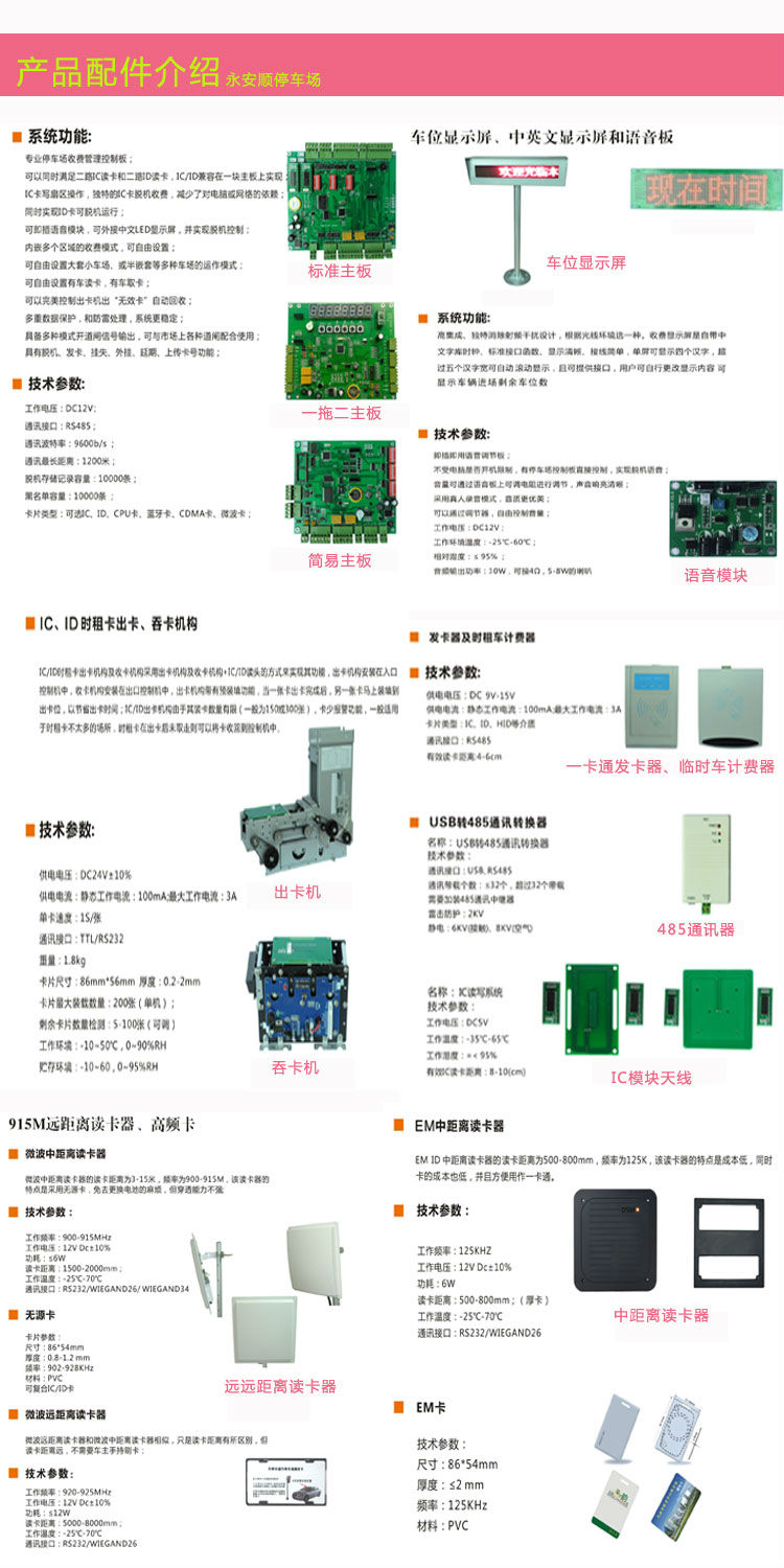 停车场系统、网络百万高清车牌识别系统、蓝牙远距离系统、ID中距离系统、挡车器、可视楼宇对讲、门禁系统、监控系统