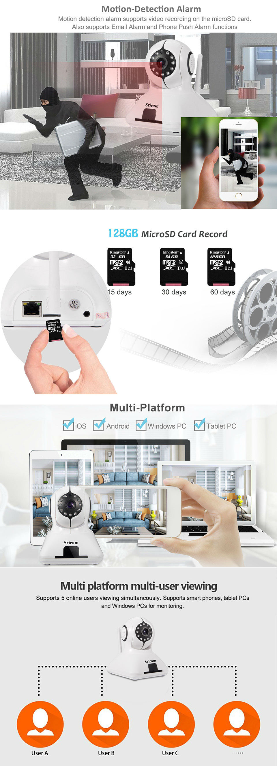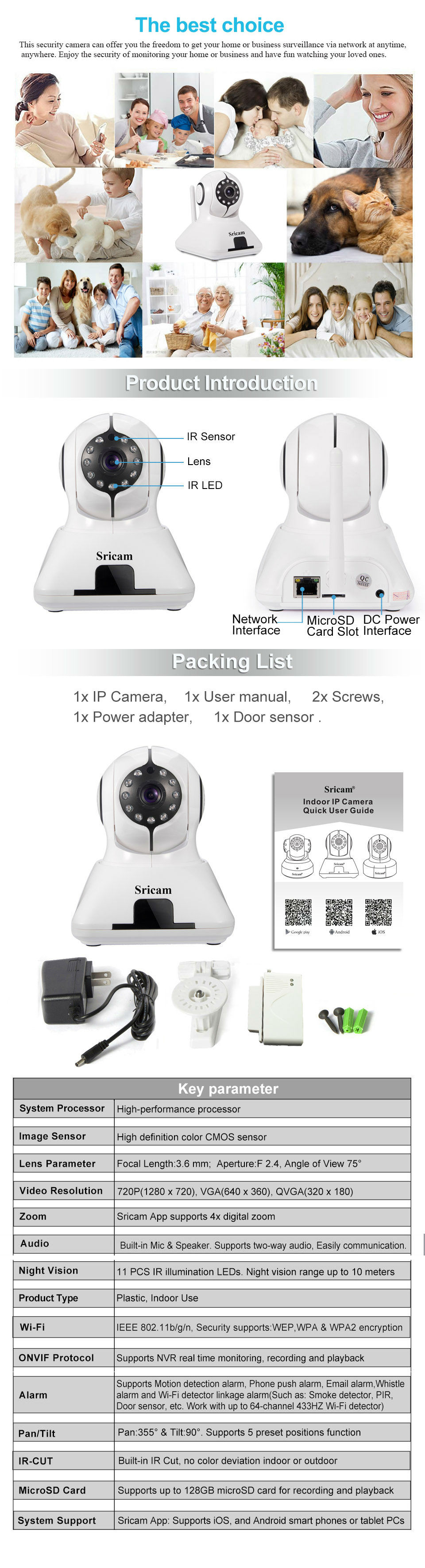 sricamip camera wifi无线监控摄像头 web camera 高清家用监控摄像机