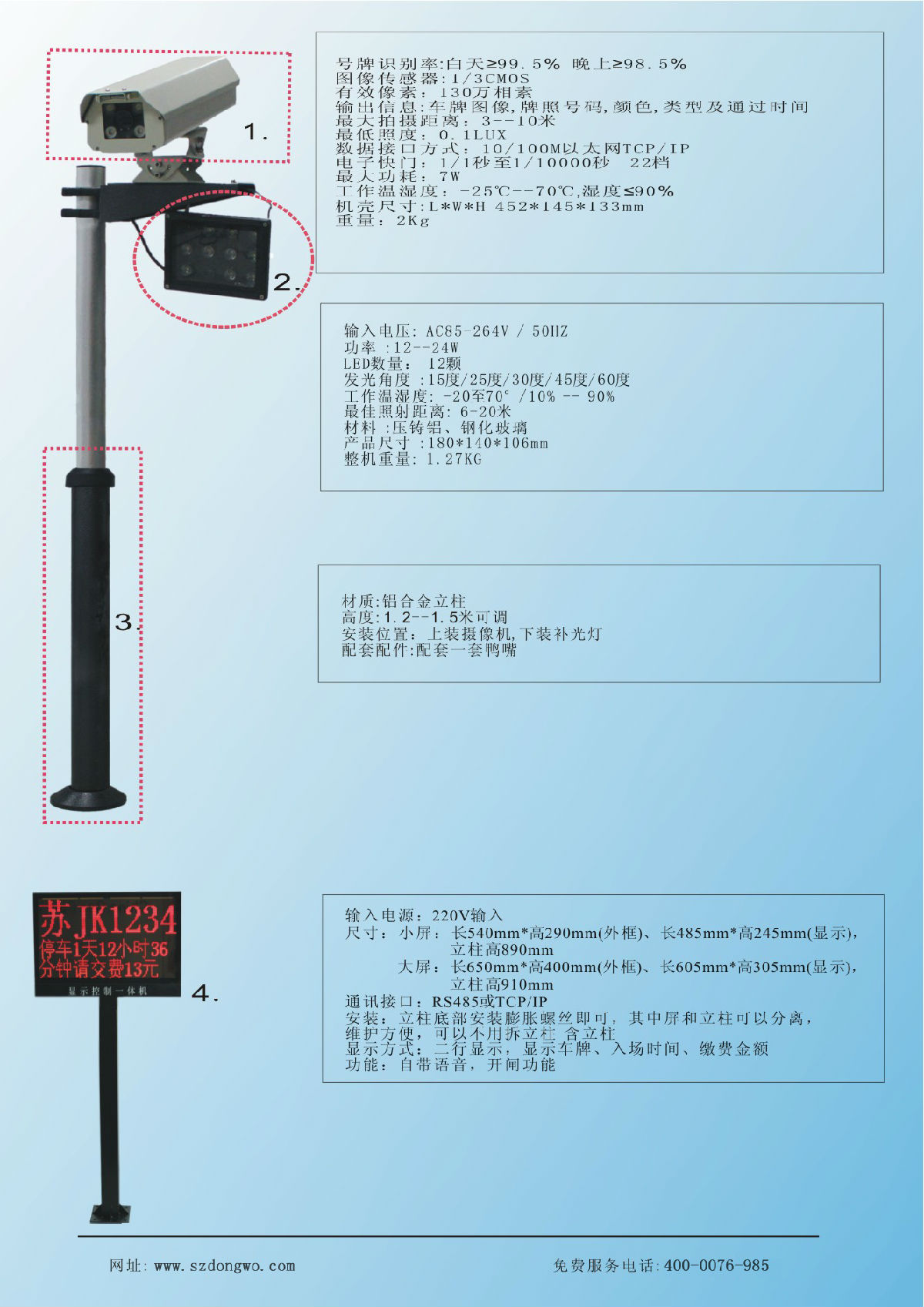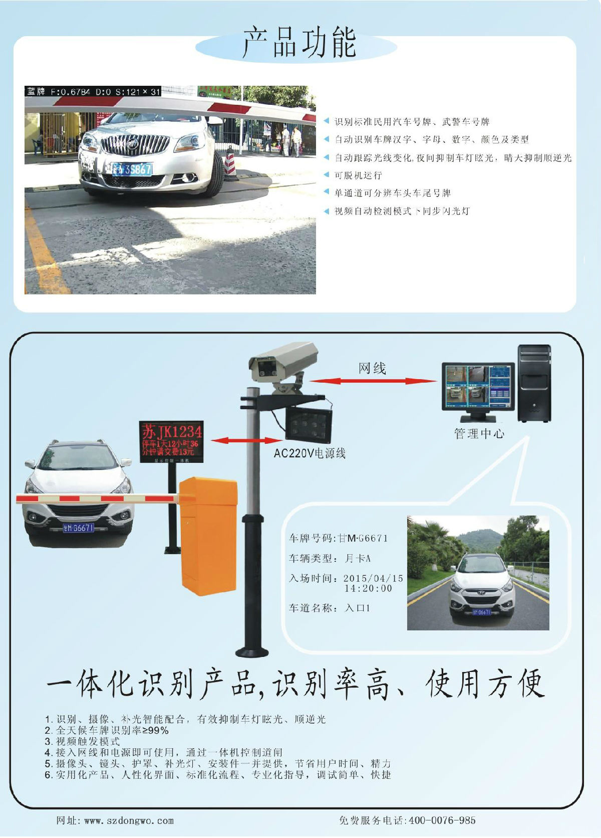 该系统是利用我公司的DW-SC02C车牌识别一体机,入场车辆不需停车的一种新型无障碍入场停车场管理系统。司机不需要在出入口停车,当车辆进入停车场入口时,DW-SC02C车牌识别一体机自动抓拍车辆照片并识别车牌号码,将车牌号码,颜色,车牌特征数据,入场时间信息等传给管理计算机,车辆可无障碍进入停车场,为用户提供了一种崭新的服务模式。