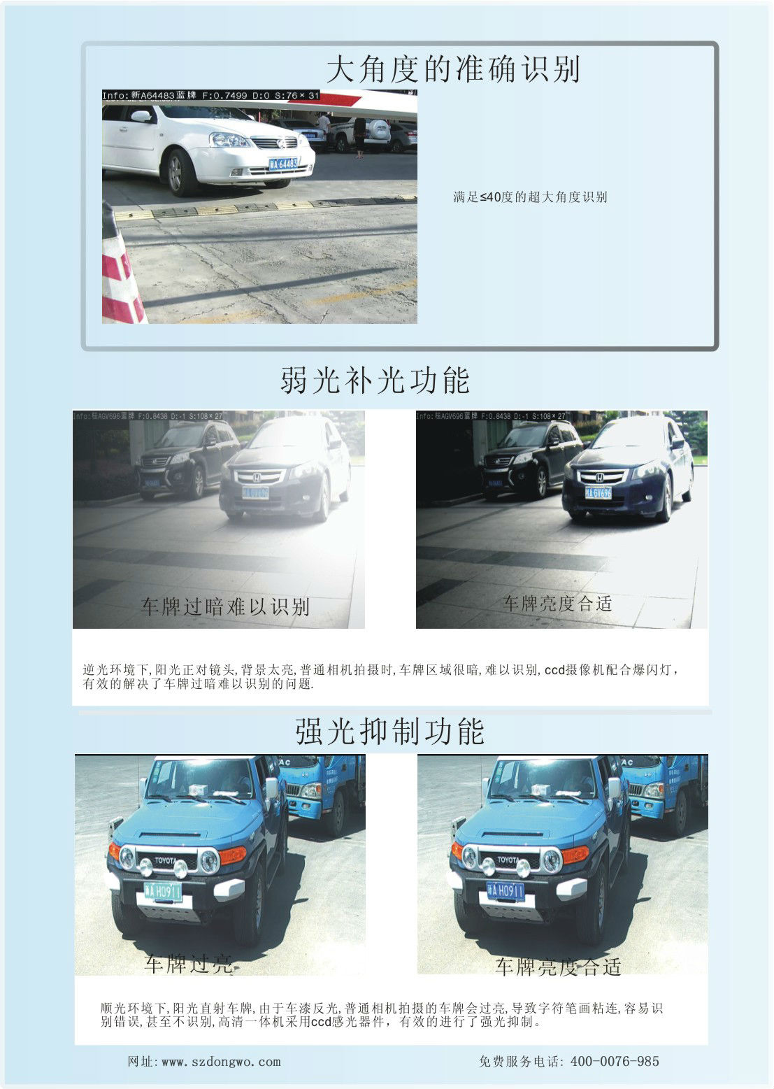 深圳东沃公司根据自己对车牌识别技术的掌握和对车辆管理业务过程的充分认识,将车牌识别技术应用于车辆智能管理流程中,从而解决了停车刷卡的传统车辆放行方式,大大提高了车辆放行效率,保证了停车场出入口通行顺畅。通过正确设计、安装,可以在多车道上同时完成车辆不停车通行而互不干扰。