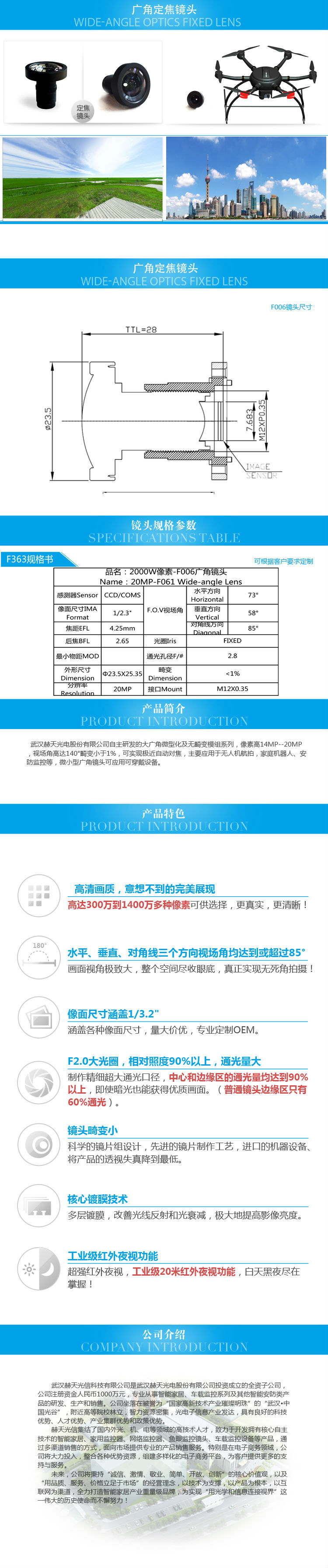 武汉赫天光电股份有限公司主营鱼眼镜头系列、大广角航拍镜头、数码相机变焦镜头系列、以及光学镜片和微小型光学零的设计与加工,光机电一体化系列产品的开发、生产和销售。