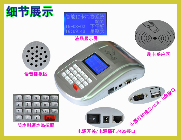 此款无线售饭机是在现有的有线售饭机基础上的升级版,它不但拥有现有消费机的全部功能,同时采用国内最新的433MHZ无线通讯技术,无障碍通讯距离达1000米,有(建筑物、墙等)障碍通讯距离可达400米左右,比WIFI距离远10倍不止。是属于完全脱机使用型,也是属于完全免布线型:不需要485转换器 、不需要USB数据线、不需要交换机,连U盘都不需要,只要在每台售饭机内部内嵌一个无线收发器,电脑端接一个无线数据接收器就搞定。真正为您节约每一笔布线成本(无线通讯可以大量减少线材的使用,降低线材使用成本,同时还可减少布线的人力资源成本,现在人工费成本比较高,无线路限制,没布线限制,同时也降低了售后维护成本。)这是目前市场上操作最简单、最方便实用、最节约成本、最让人省心的一款消费机。被业内人式称为消费机中的神器。此款售饭机不管是学校、工厂、企事业单位食堂、美食城或超市小卖部、快餐店、购物店、高档会员刷卡消费、游乐场所等通通适用。现厂价直销,全国首发最低价