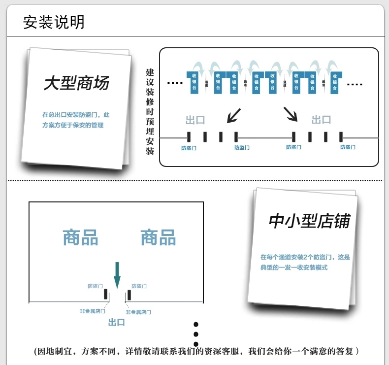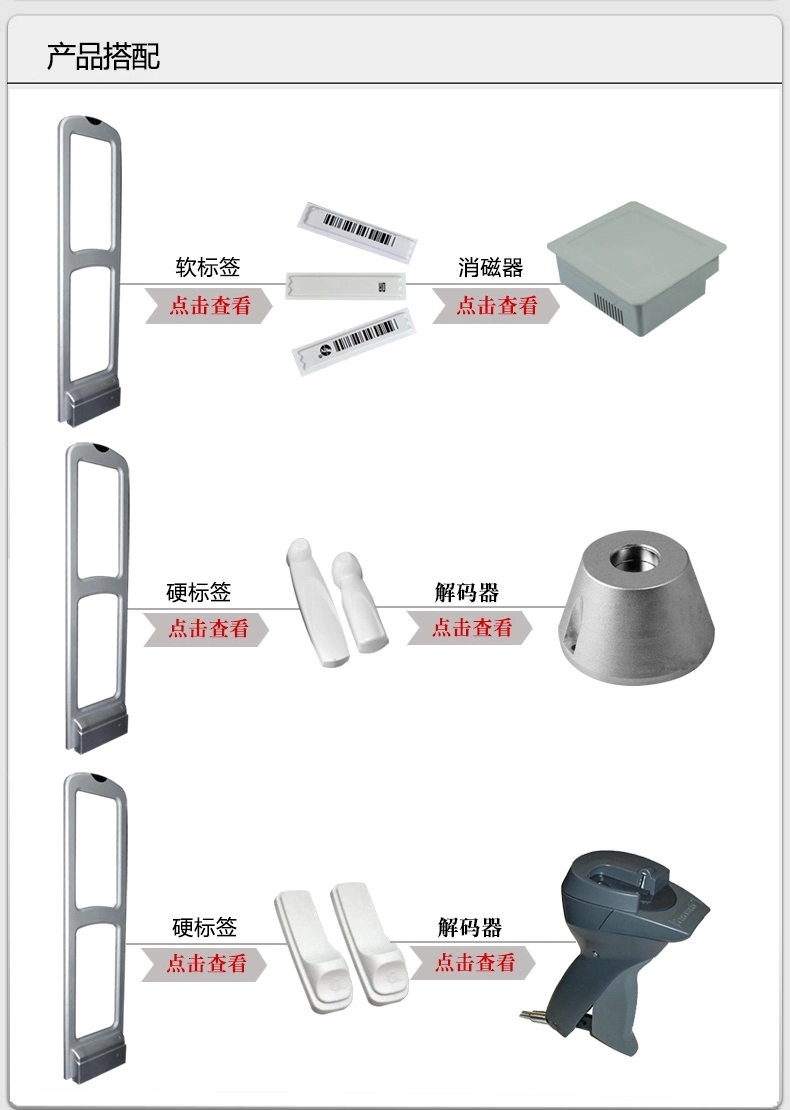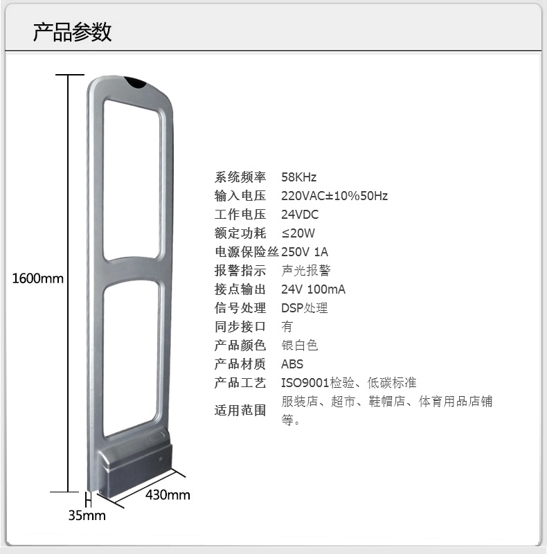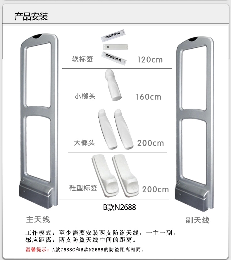 PVC材料,主机和天线集成为一体,安装、调试简单,即插即用,针对中小型服装店、超市、鞋帽店、体育用品等品牌店而设计,通过欧盟CE标准、国家质检中心检验,现大量出口60多个国家。