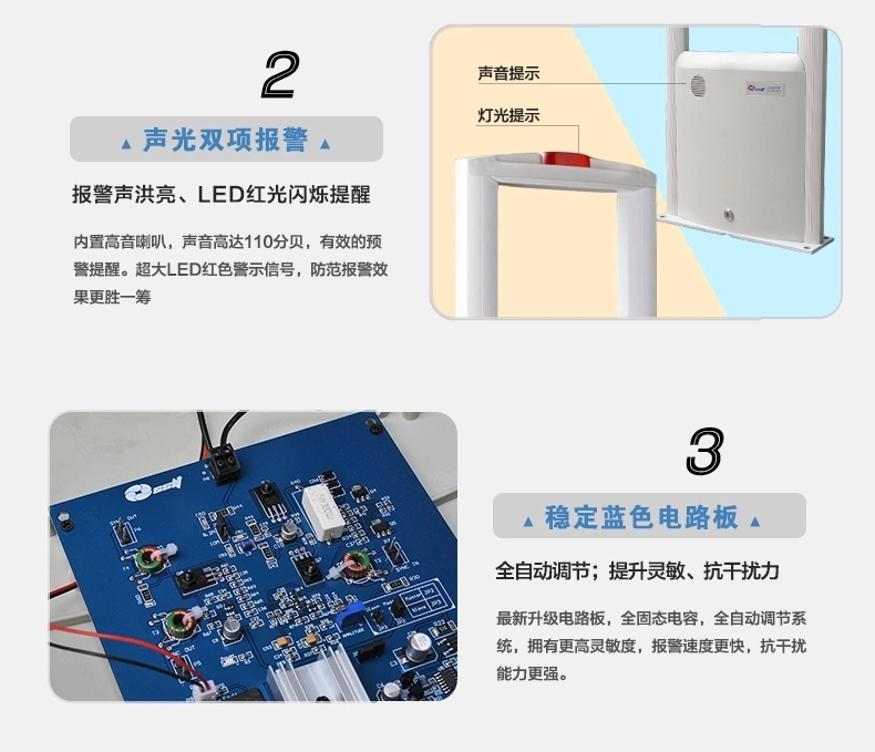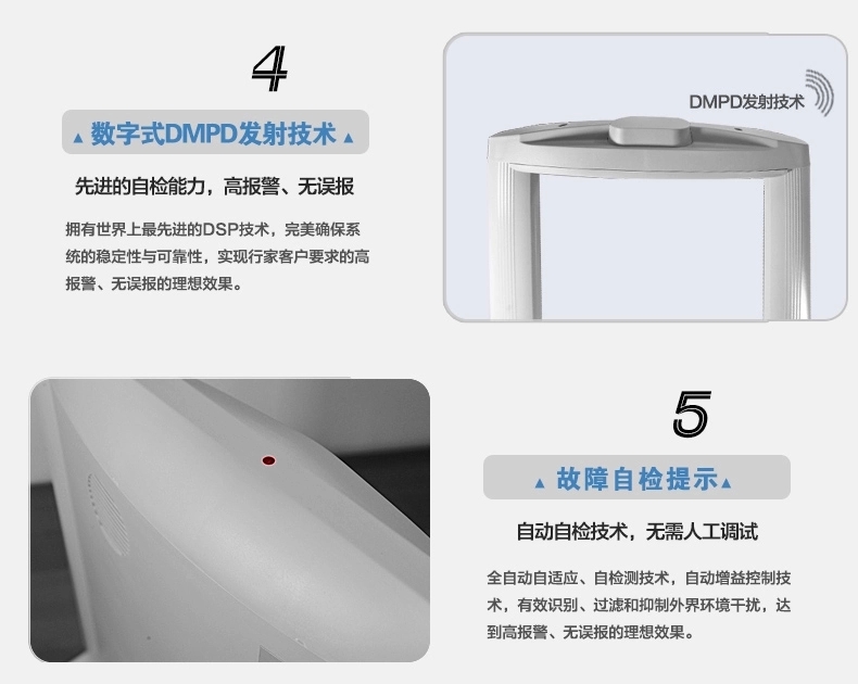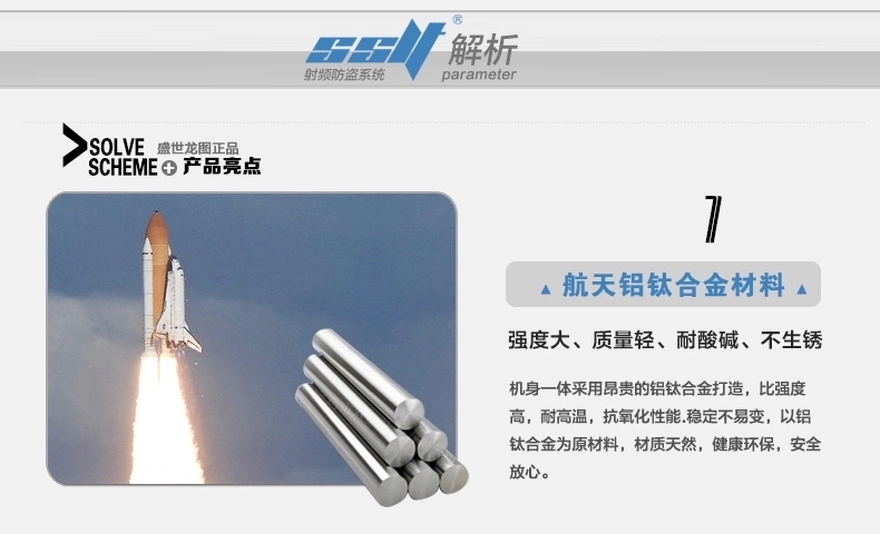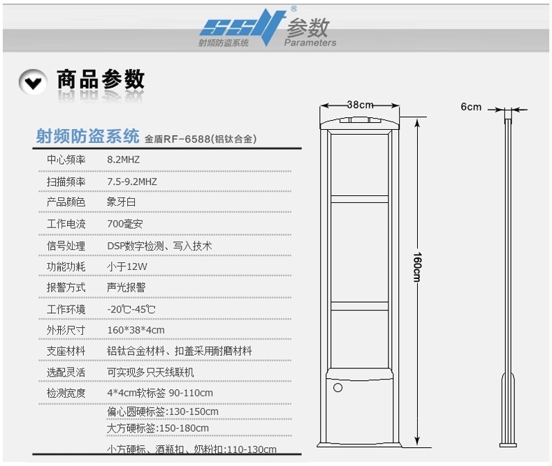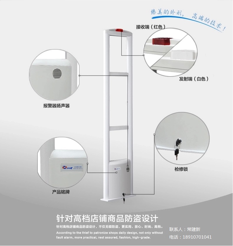 铝钛合金机架,先进的数字信号处理技术,安装宽度可达2米以上,具有精确的报警和超高的检测率,通过公安部安全与警用电子产品质量检测中心检验;是针对国内外中小型超市、服装、鞋帽、箱包、体育用品店等开架卖场而设计。现大量出口欧盟、美洲、俄罗斯、蒙古等多个国家。