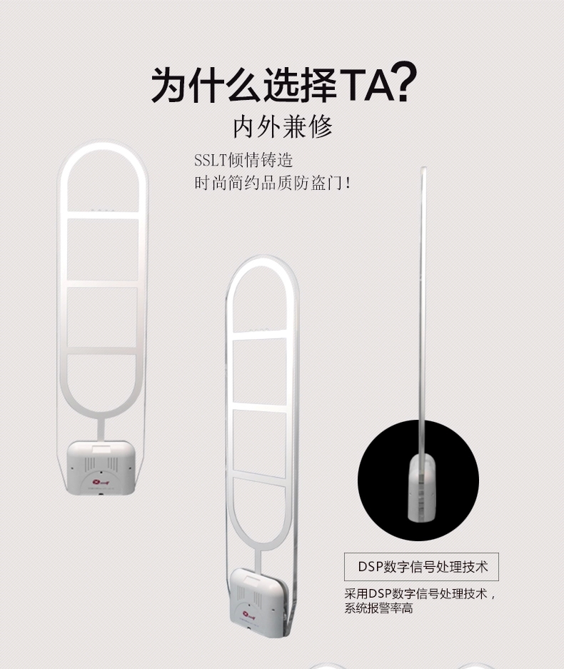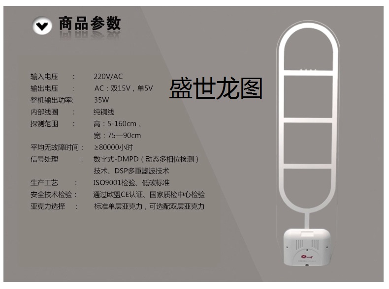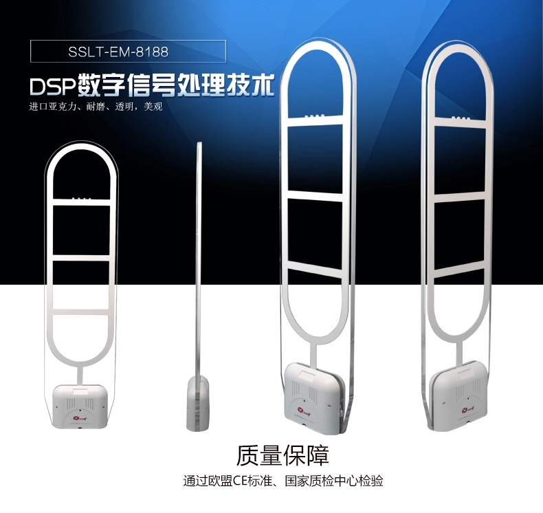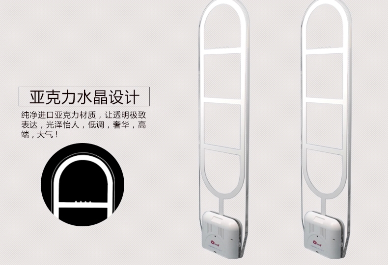 采用纯进口全亚克力材料设计、耐磨性强、晶莹剔透,灯光采用全反射,先进的液晶显示人次统计系统,具有精确的报警和超高的检测率,通过电子产品质量检测中心检验,是国内外高档图书馆、大型书城、书店、图书馆、药店、音像店、化妆品店首选产品,现大量出口国外50多个国家。
