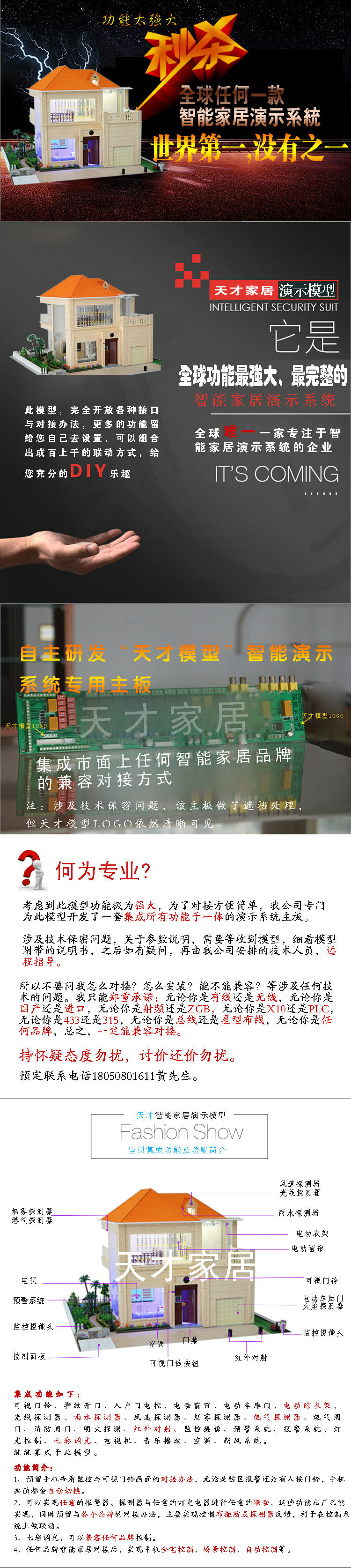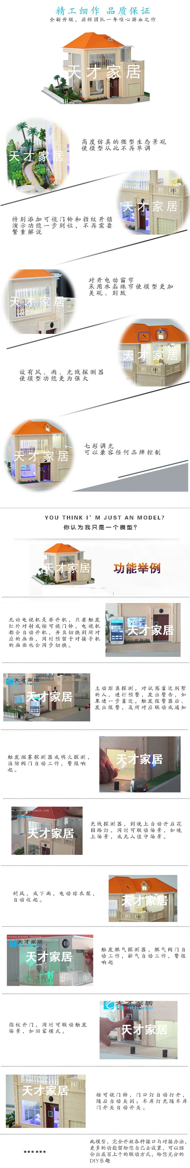 本模型由尺寸62*62*1375px(二层型)的别墅型作为依托,不到10千克,非常方便携带,一个女孩子都能轻松拿走,轿车后座、SUV后备箱都非常好放。外观精美、档次高雅。本模型系统集成了:可视门铃、指纹开门、入户门电控、电动窗帘、电动车库门、电动凉衣架、光线探测器、雨水探测器、风速探测器、烟雾探测器、燃气探测器、燃气阀门、消防阀门、明火探测、红外对射、监控摄像、预警系统、报警系统、灯光控制、七彩调光、电视机、音乐播放、空调、新风系统。保留所有实际功能,既缩小版的智能家居,用户用手机或电脑就可以进行远程控制。