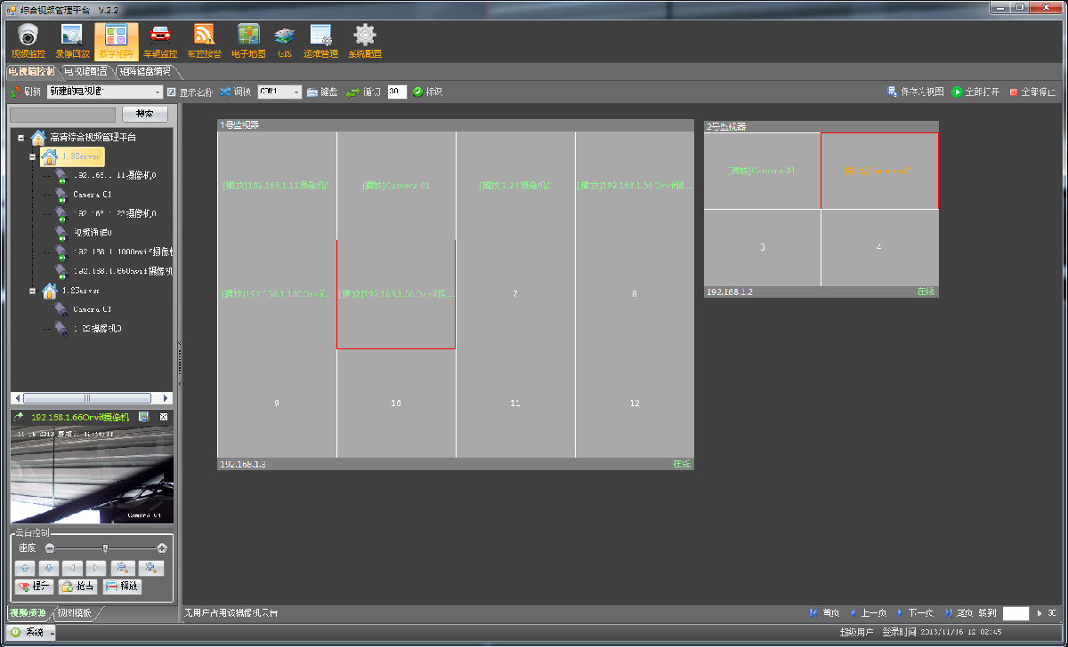 4)PTZ预置位轮切功能:对于支持PTZ功能的摄像机,系统能够设置多个预置位,以轮切方式巡视多个区域现场的详细情况;