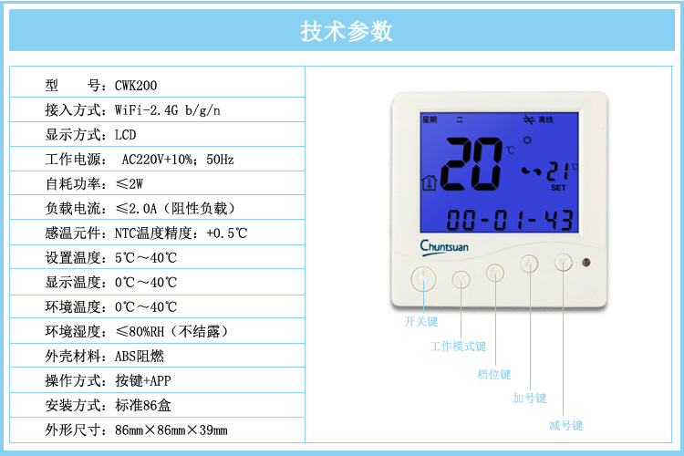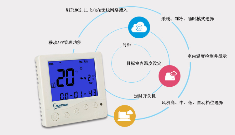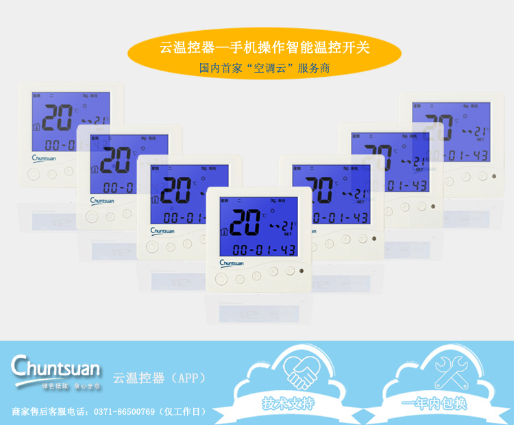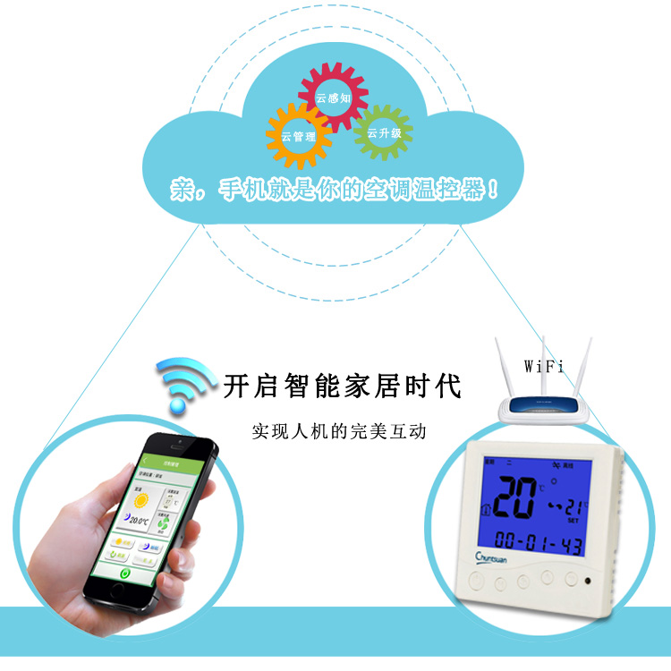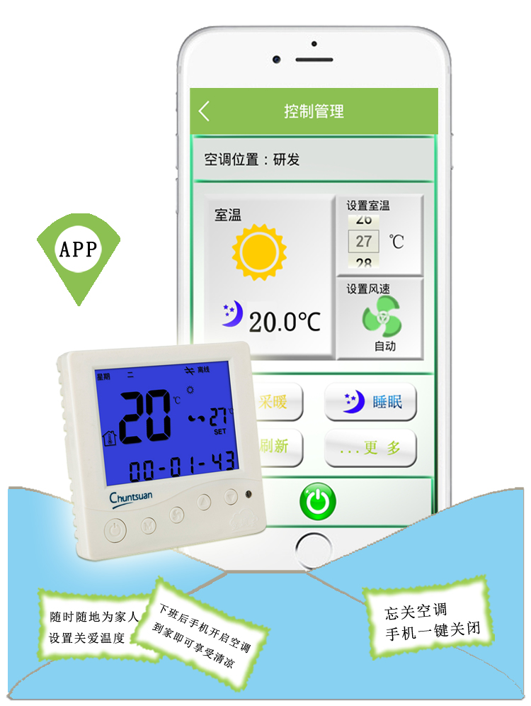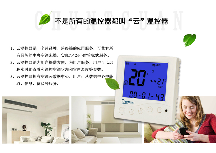 云温控器是一款应用于中央空调远程控制的终端智能产品。有了她你就可以不受时空约束的用手机与室内空调进行智能互动,不论你身在何方,均可与千里之外的空调随时互动,可以根据所监测室内温度、空调运行状态等信息,对所监测房间的空调进行远程节能智能化控制管理,做到合理地控制室内空调温度,从而使传统空调更加节能、智能、舒适。