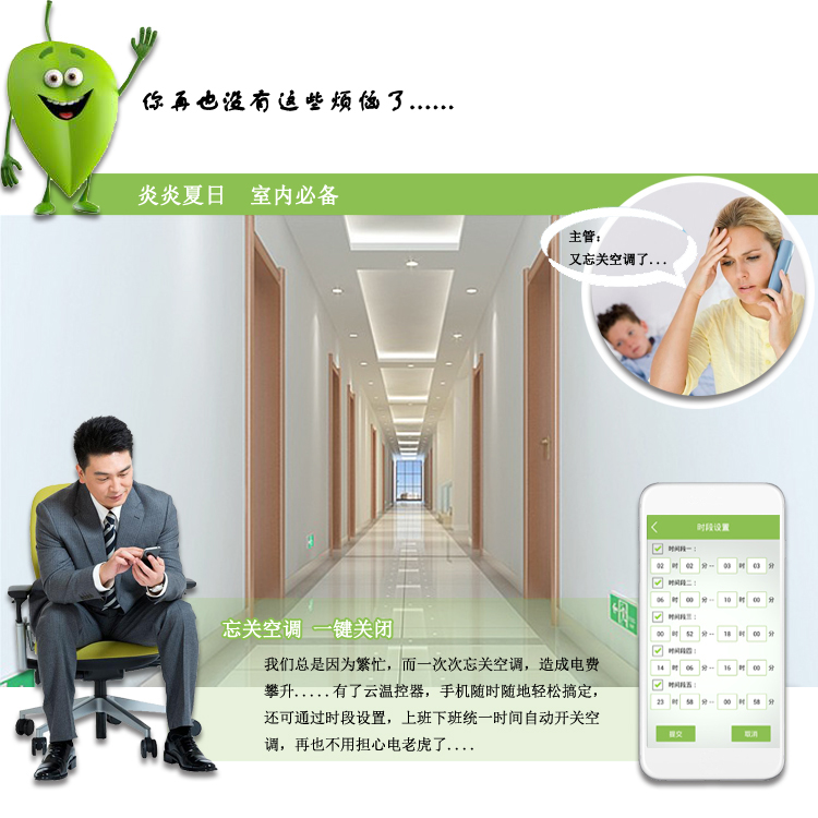 忘关空调,手机一键关闭/下班后手机开启空调,到家即可享受清凉/随时随地关爱家人的冷暖。