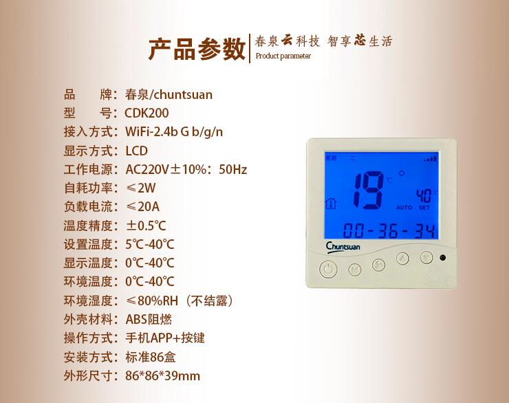 春泉CDK200云电暖温控器基于移动互联网技术,采用高科技云技术,专利智能芯片,实现手机智能双温双控的云电暖温控器。通过互联网实现云端操作和管理的自控设备,云电暖温控器适用于工业、商业、家庭居室中的电热采暖器的温度控制。