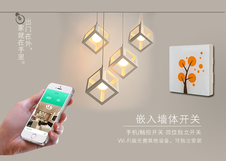 4.云开关具备智能化的功能,配备了联网功能,无线WiFi通讯方式,在任何地方,只要打开手机就可以控制家里的任何开关,实现对照明灯的远程管理。