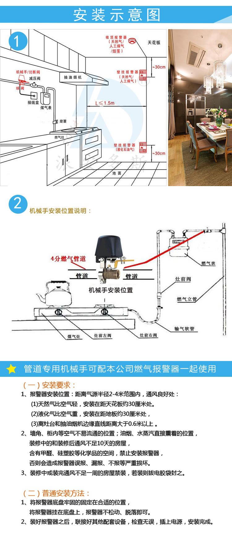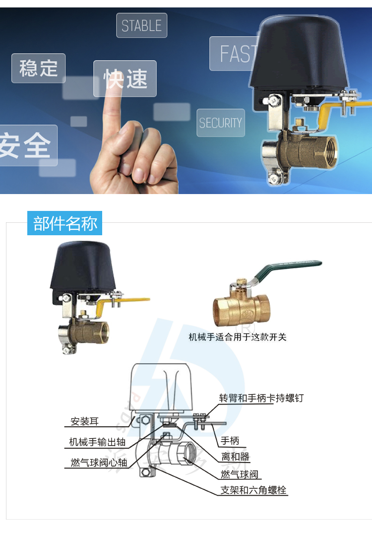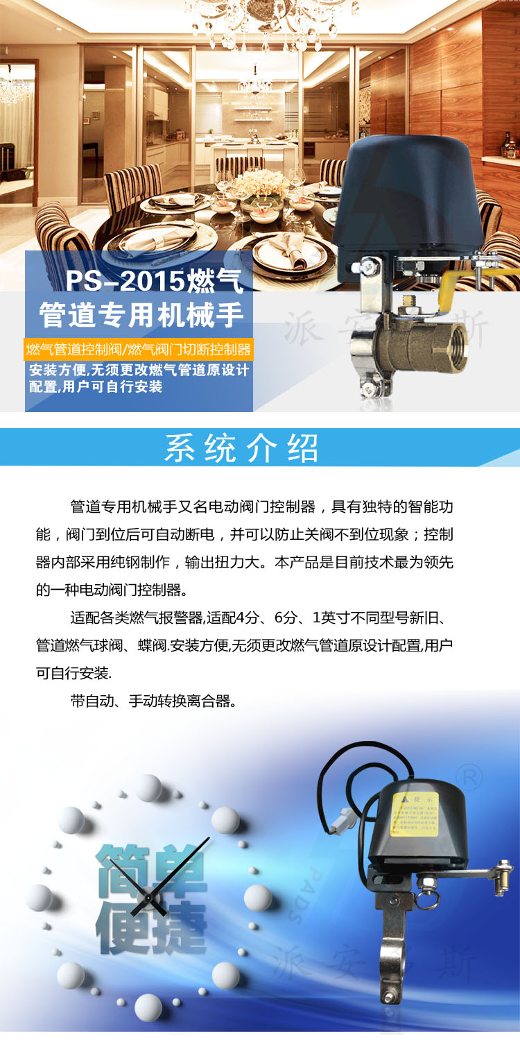 1、适配各类燃气报警器,适配4分、6分、1英寸不同型号新旧、管道燃气球阀、蝶阀.安装方便,无须更改燃气管道原设计配置,用户可自行安装.