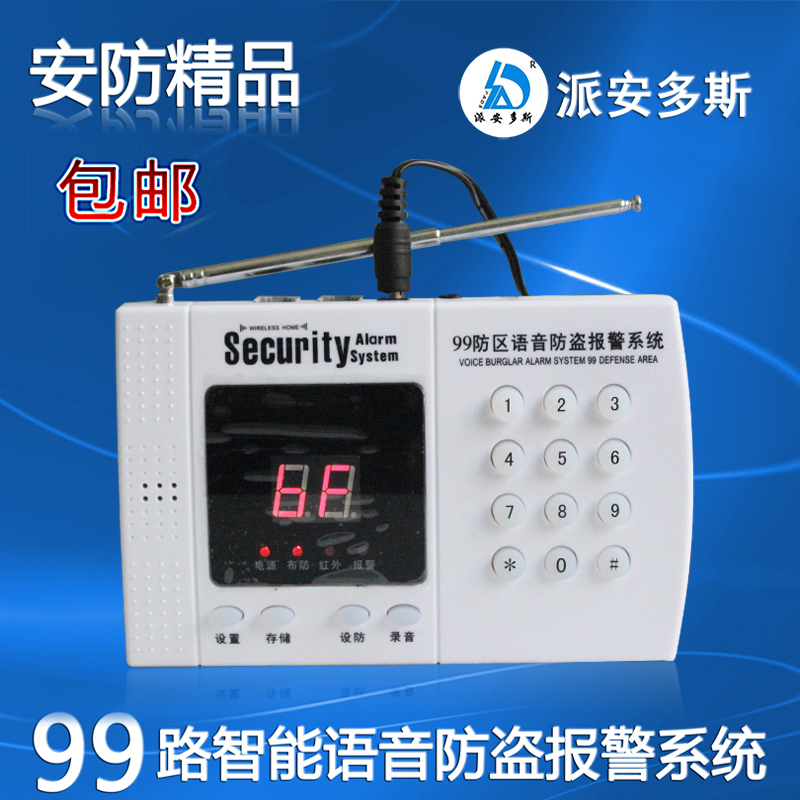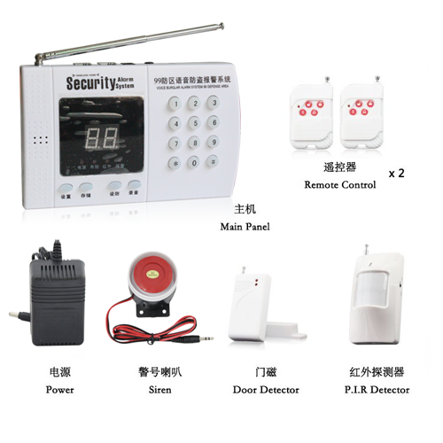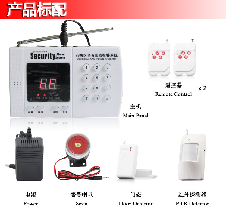 标准配置:99A主机一台、遥控器两个、无线门磁一个、高分贝警号一个、广角红外一个、UPS电源一个、彩盒包装