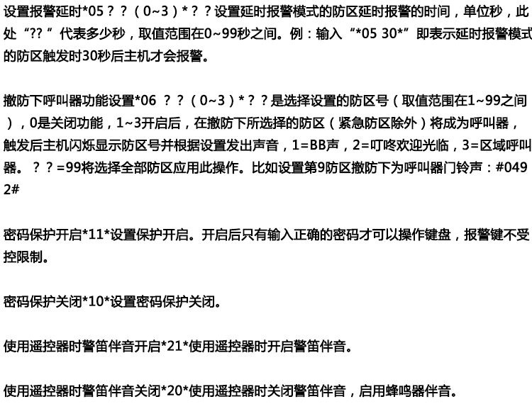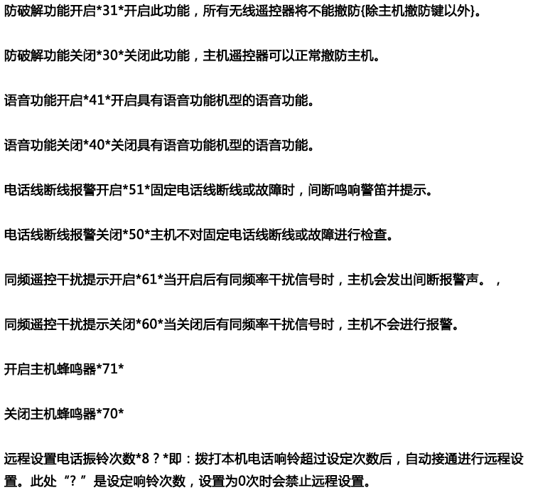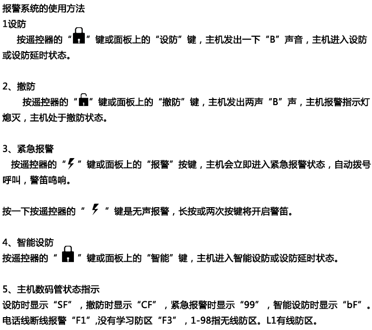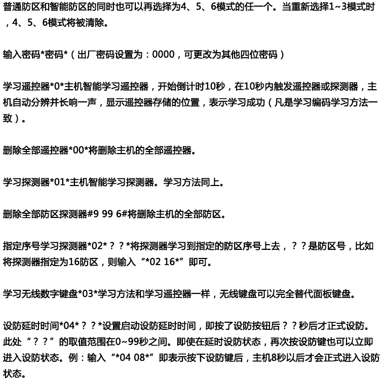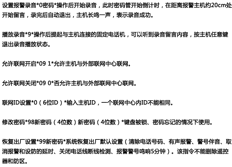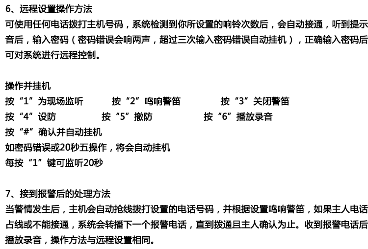 ●异地远程监听功能,远程电话布防撤防,可学习99个遥控器及99个探测器