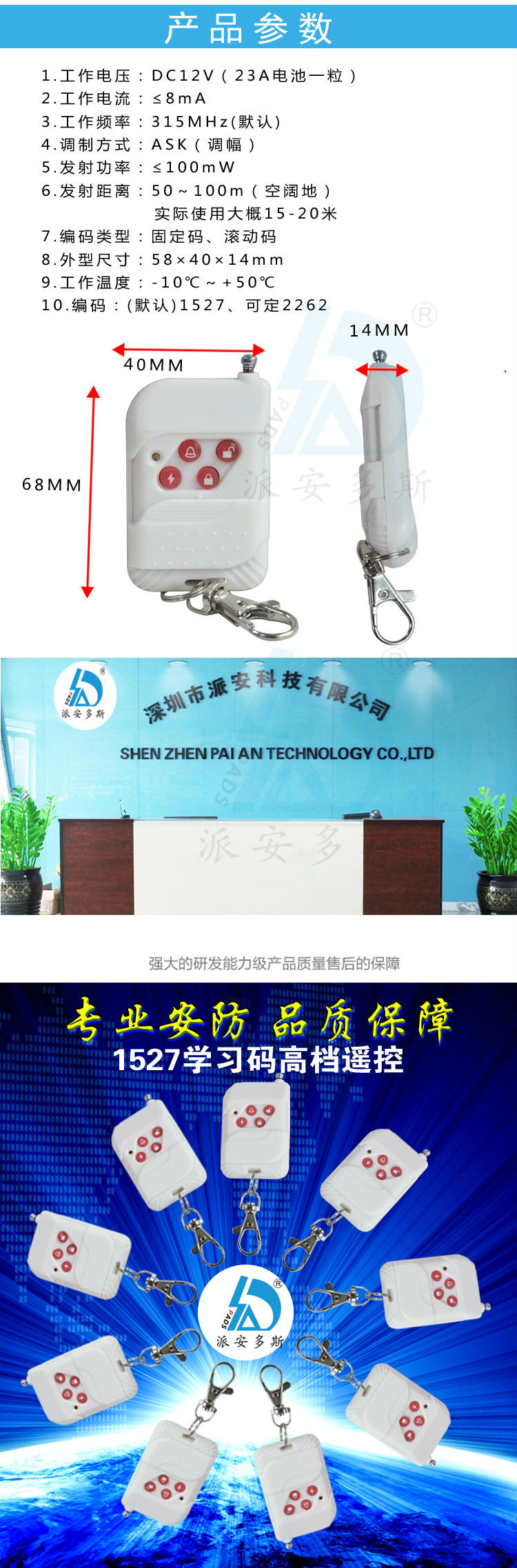 发射频率:433MHz±1MHz 315MHz±1MHz