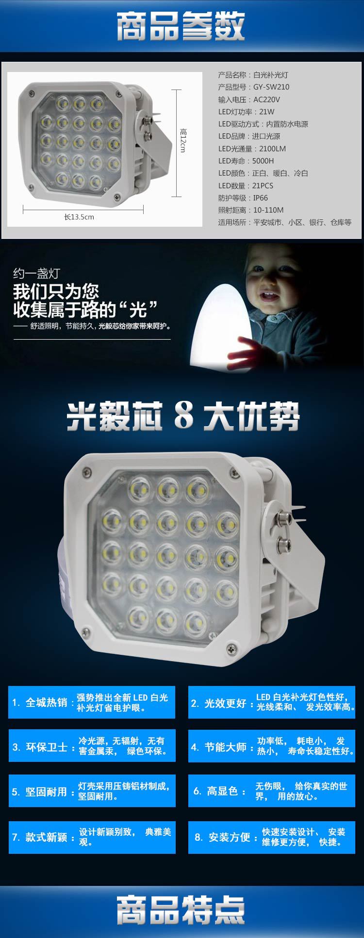 适用范围:平安城市 银行 博物馆 监狱 小区 仓库等室内外视频监控补光