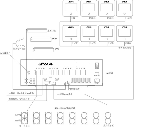 IBA家庭背景音乐系统采用星型布线结构,主机是系统的中心,标准控制面板或者液晶控制面板通过8芯线或者4芯线与主机相连接,喇叭选用300编音响线与主机相连接。控制线: