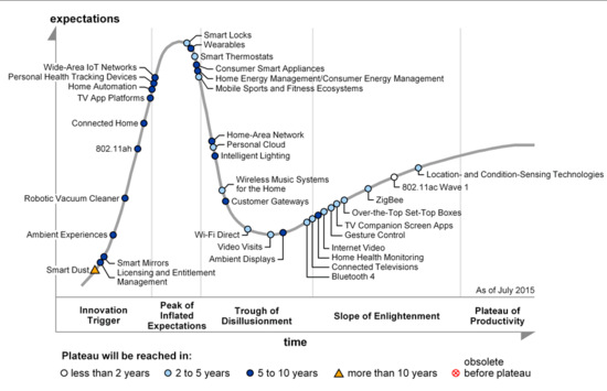 例如,Gartner的2015 Hype Cycle for Connected Homes显示科技公司和应用程序开发商向消费者推送的很多设备都处在期望膨胀期, 尽管至少智能家居自身等待着激发创新。这里的关键词是大肆宣传。
