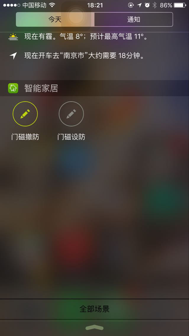 由于大多手机用户都会设制密码,所以如果控制智能家居需要先解琐手机无疑将会相当复杂,不过Widget场景并不存此问题。事实上,Widget场景不但不需要打开APP,其实还不需要解锁智能手机。换言之,Widget场景操作至多要三步:“点亮手机屏幕”——“下滑屏幕,进入通知中心”——“直接操作”。