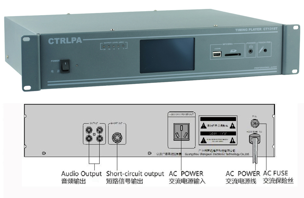 * 有一路短路信号输出接口与定时电源输出联动,一路音频信号输出接口(4个插座并联输出)。