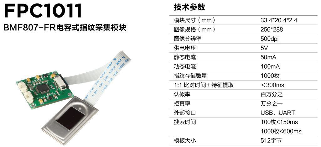 BMF系列电容式指纹模块,是一种接触式单指识别设备,由电容式传感器和指纹识别处理模块构成。