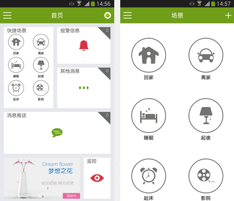 报警信息和各种感应设备是相关联的,从图中也可以看见,当感应器感应到有人接近时,就会向手机推送信息。这个版块看似简单,发挥的作用可大了。设想一下,当你离家远行,家里有陌生人接近,手机及时收到消息,你就可以第一时间进行处理,保障家里的财产安全。