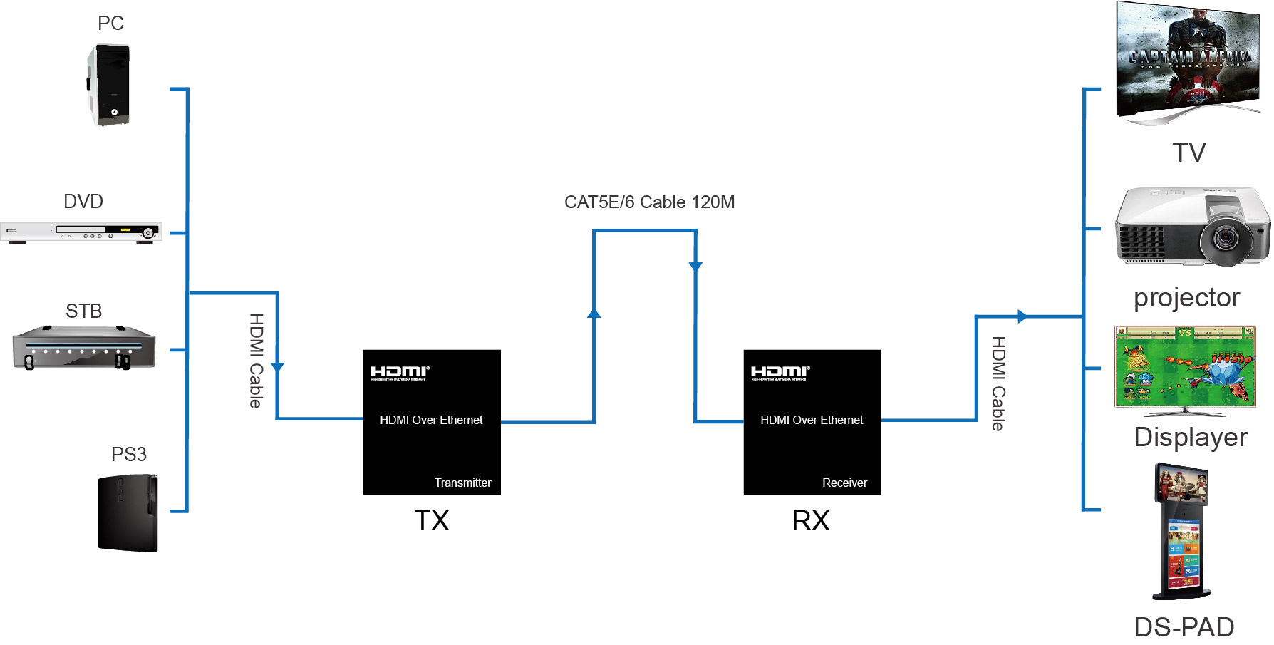 HDMI双绞线传输器1对1传输连接图: