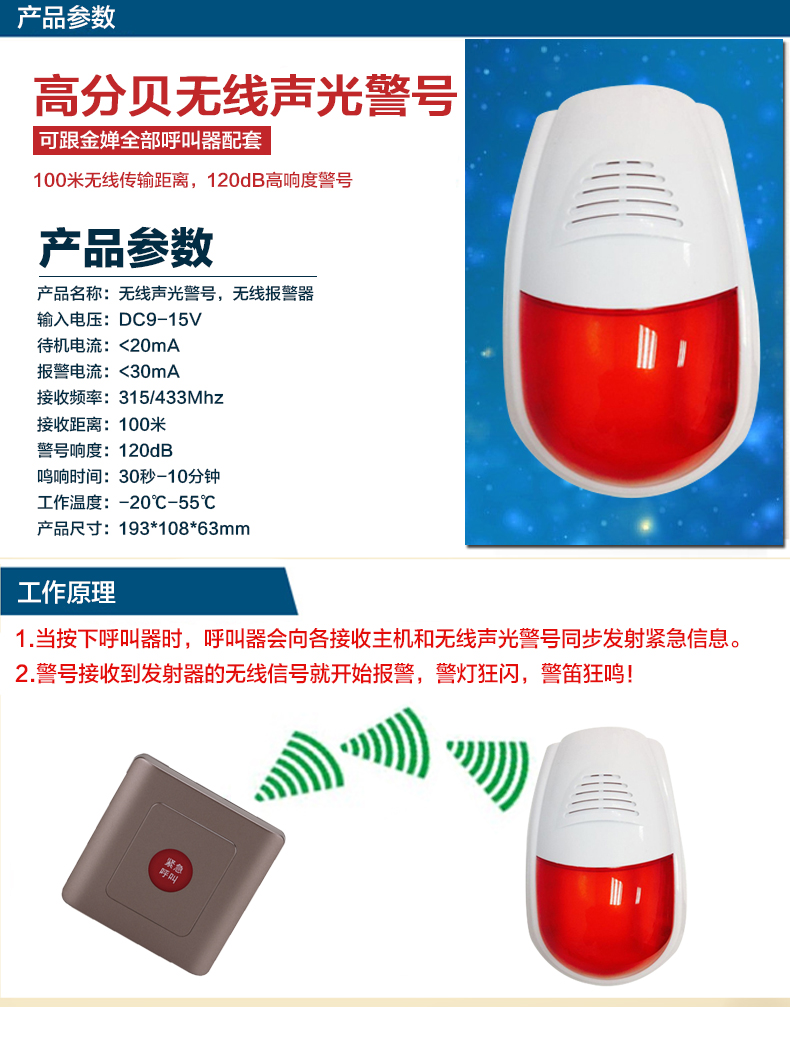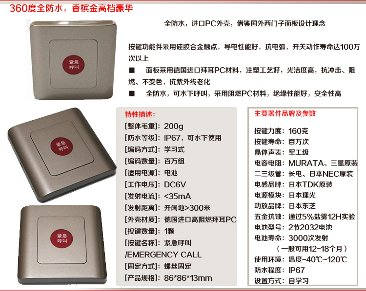 音量大小及报警时长均可调节,配合86盒防水的呼叫器。按下后发出120分贝的报警声,并且警灯会狂闪,非常醒目。是残疾人甚至聋哑人场所也可以使用。