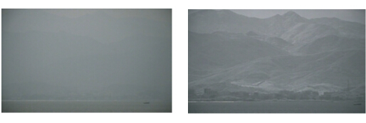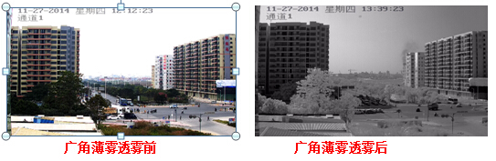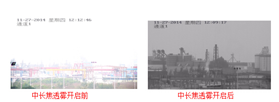 广角端开启透雾,可以得到对比度鲜明的远端景物轮廓,容易发现远程目标(例如右侧楼边的黑烟)。长焦端,由于天气有雾,而且逆光严重,画面本来由于雾气的影响已经模糊,加上强逆光,或者高度背光的环境,导致画面发白,景物模糊无法辨别。打开光学透雾功能,由于镜头本身特殊的SMC镀膜处理,在近红外波段大幅度抑制逆光,加上特殊的透雾镜片,体现出800nm-1100nm的近红外光穿透能力,得到了清晰对比度明显的图像。