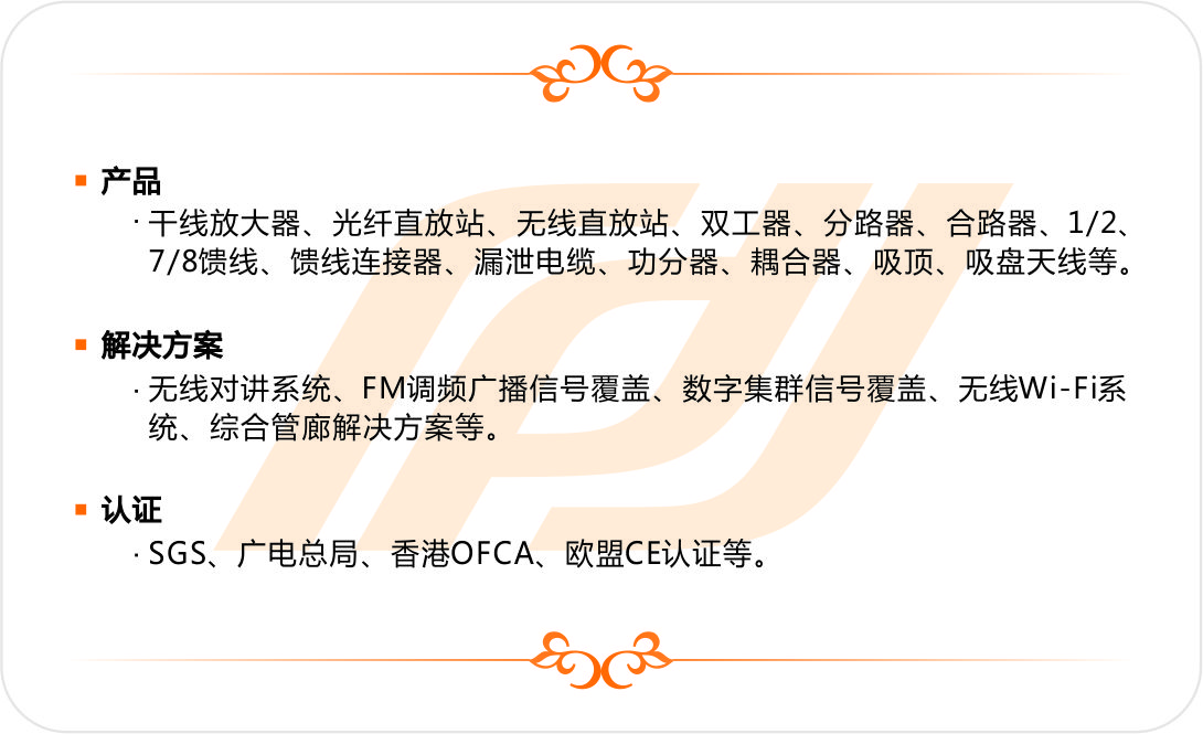 解决方案:无线对讲系统、FM调频广播信号覆盖、数字集群信号覆盖、综合管廊解决方案等。