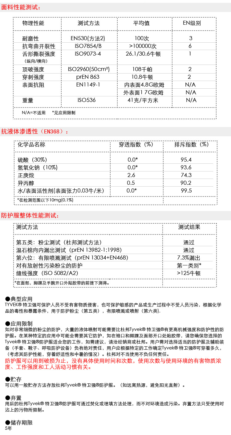 杜邦防护服本身由100%高密度聚乙烯制成,不含填充剂、粘合剂、和硅。透气、透湿 ,轻盈坚韧