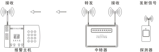 Z08无线信号中转器的主要功能是转发探测器或发射器的报警信号给报警主机,间接地延长发射距离,扩大报警器的布控范围。用于主机与探测器距离较远或中间有障碍物导致收发信号不理想的场合。也可作为一台现场报警器使用,中转器工作示意图如下: