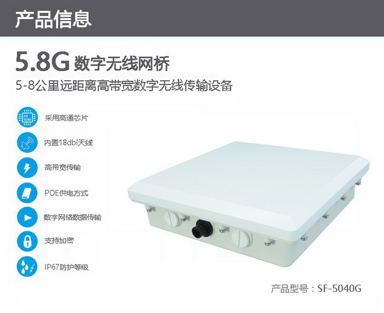 SF5040G高功率室外型无线网桥,传输距离在5-8公里范围,传输带宽可达80-90Mbps,应用过程中不仅支持一对一传输,而且还可以支持一对多传输。广泛应用于建筑工地、森林防火等特殊环境。