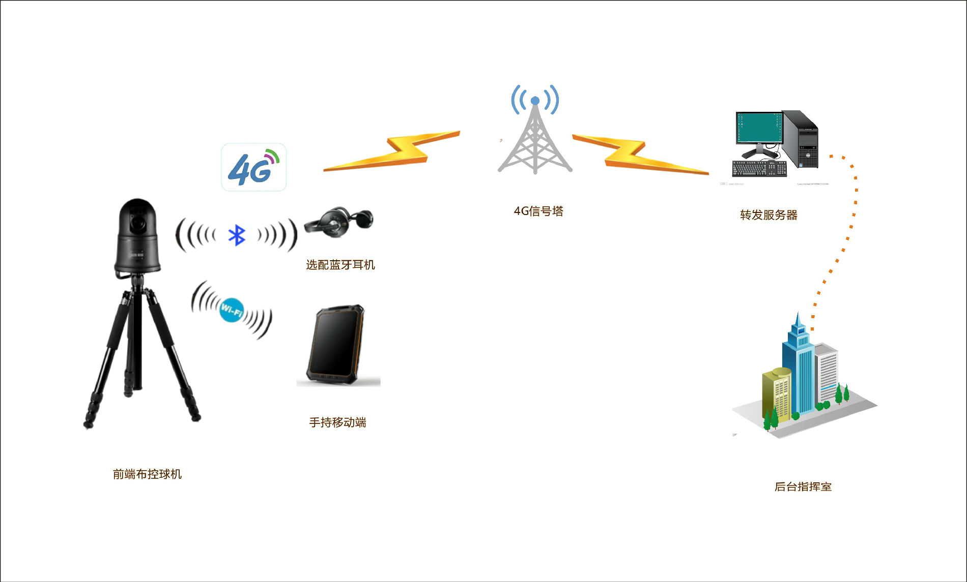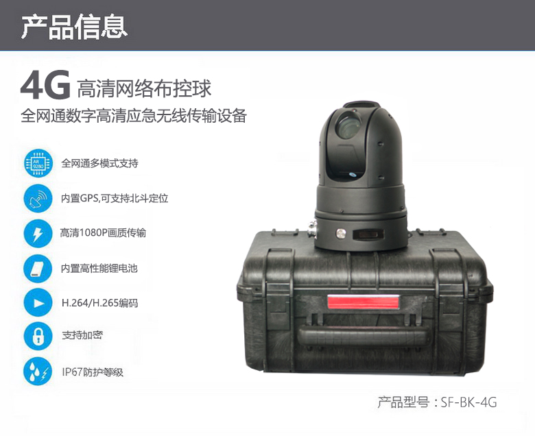 SF-BK-4G高清布控球是一款功能全面、携带方便的无线视频应急指挥一体化产品。内置高性能锂电池,4G全网通无线通信模块,传输图像清晰流畅,最高可达1080P。